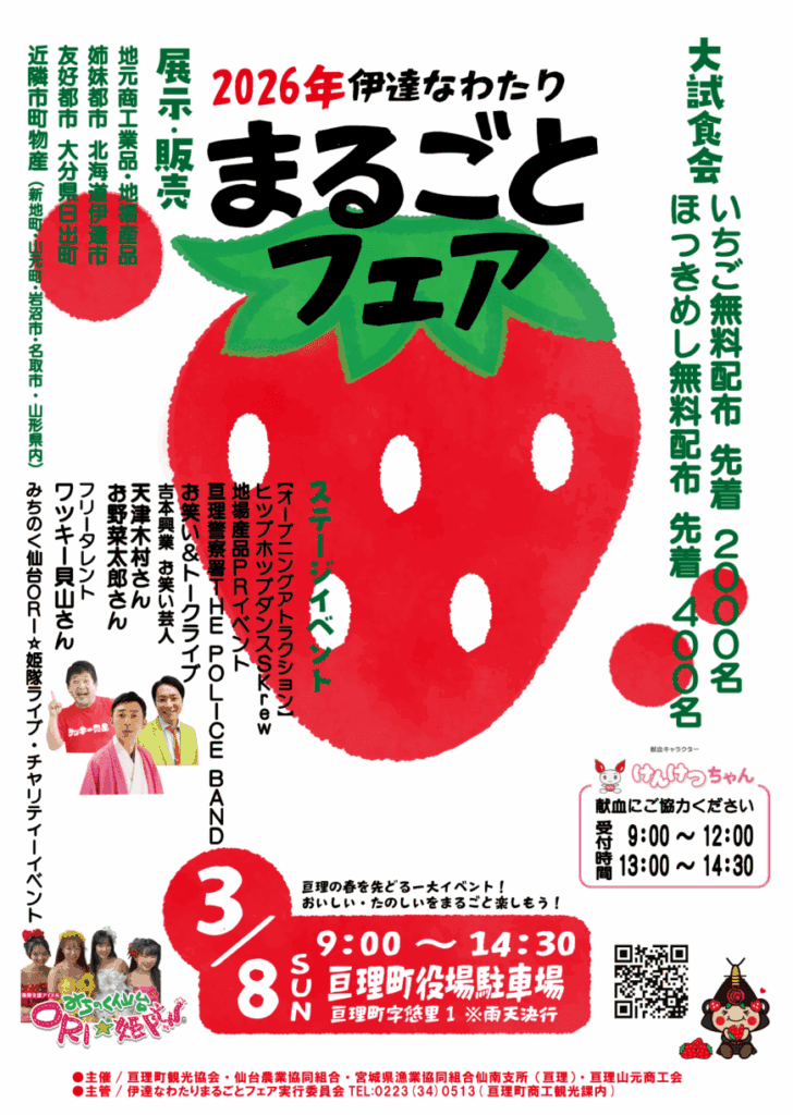 【3/8】🍓伊達なわたりまるごとフェア | いちご2,000食試食&ほっきめし(宮城県亘理町)