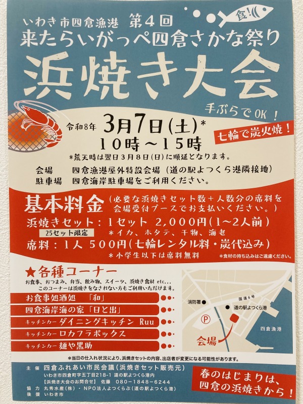 福島県いわき市・四倉漁港で開催される人気イベント 「第4回来たらいがっぺ四倉さかな祭り 浜焼き大会」 が、2026年3月7日(土)に開催されます。 会場は 四倉漁港内特... 福島