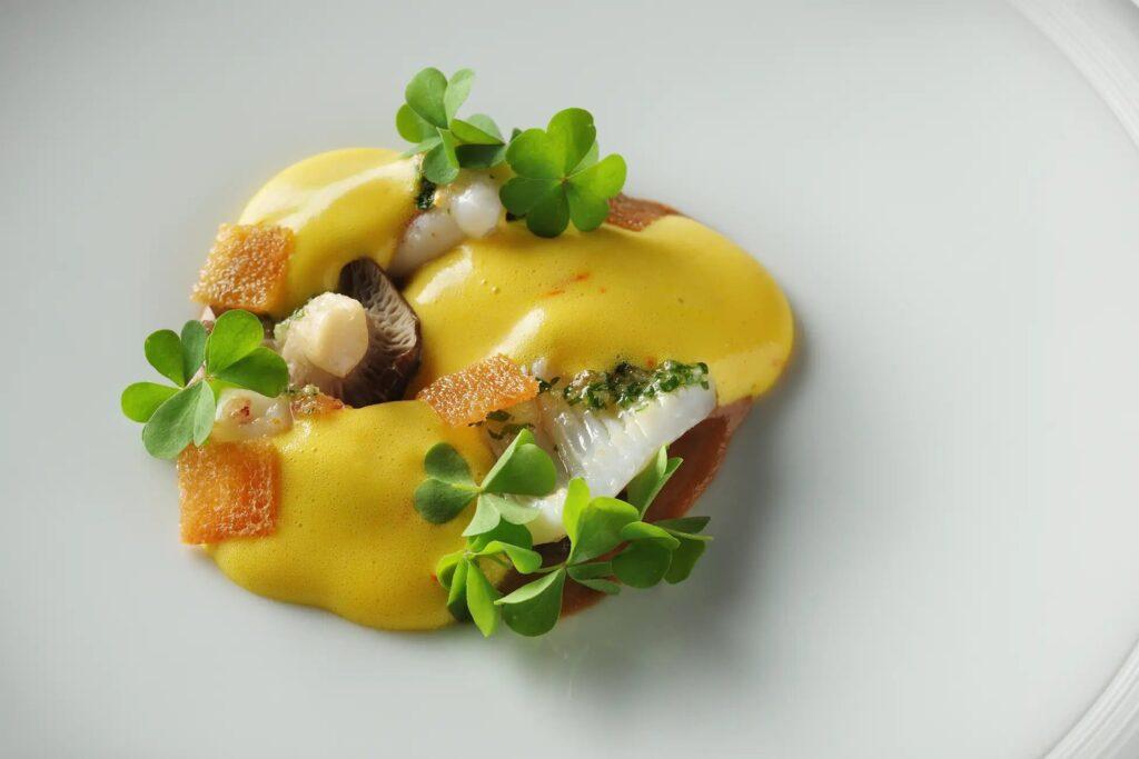 スルメイカと濃厚な肝のソース、秋のキノコを合わせ、サフランが香る一皿に。港町の知恵を感じさせる温前菜です。