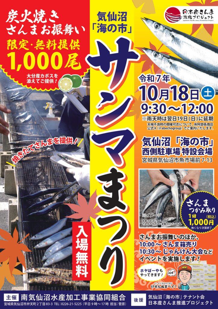 2025年10月18日(土)午前9時30分から「海の市」(気仙沼市魚市場前)で開催され、炭火焼きのサンマ1,000尾を無料で振る舞います!