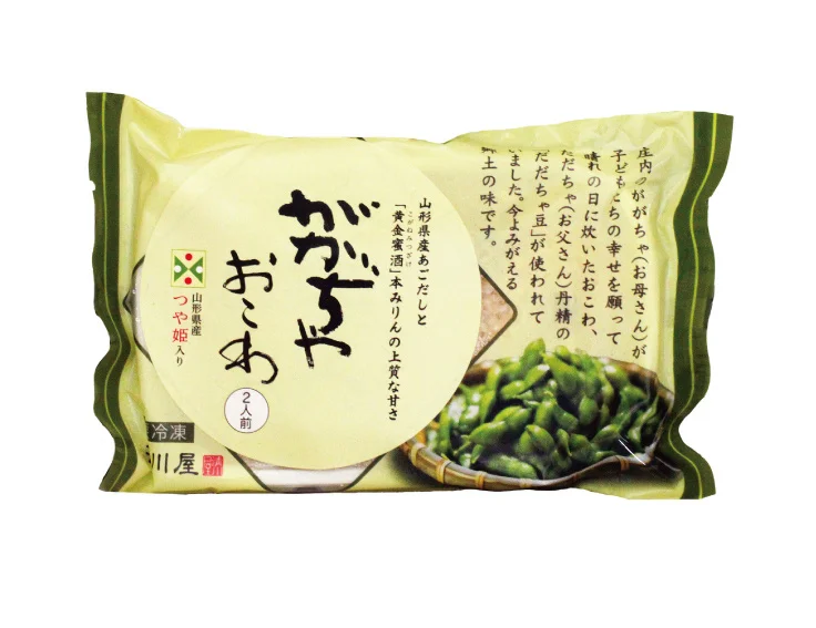 「ががちゃおこわ」は、鶴岡のだだちゃ豆農家に伝わる郷土料理をもとに、農家と清川屋が共同開発したおこわ。