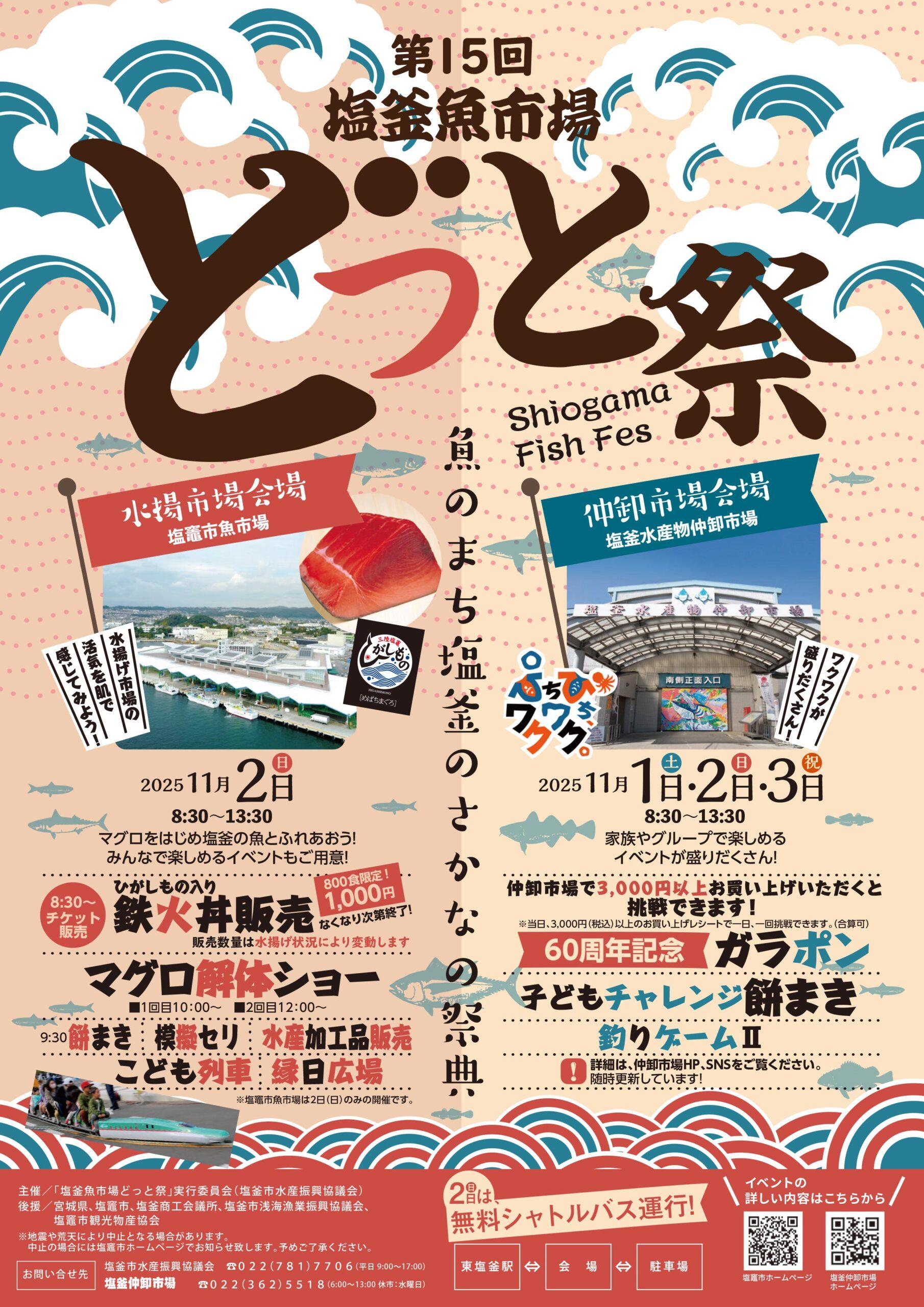 2025年11月1日(土)〜3日(月) の3日間、塩釜水産物仲卸市場と塩竈市魚市場の2会場で行われます。