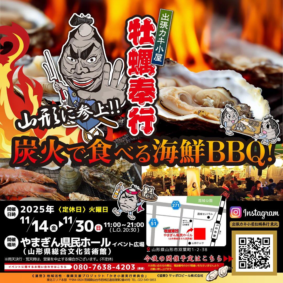 2025年11月14日(金)〜30日(日)の17日間、やまぎん県民ホールのイベント広場にて開催され、殻付き牡蠣をはじめ、ホタテ・エビ・牡蠣飯・牡蠣汁など、海鮮BBQを楽しめる人気企画です。