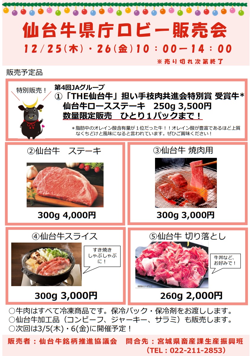 🥩【12/25・26】県庁ロビーで仙台牛販売会開催!特別賞受賞「THE仙台牛」数量限定販売(宮城県仙台市)