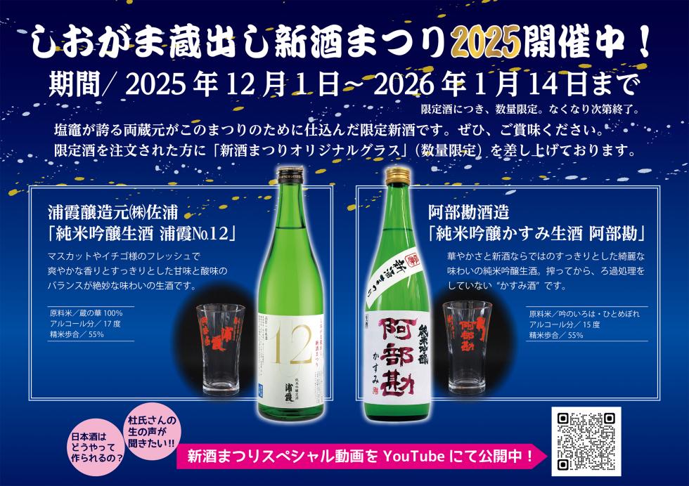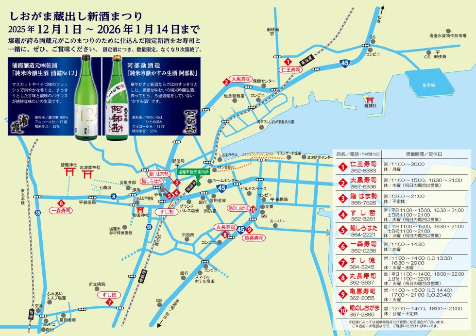 塩竈市内2つの蔵元が、このまつりのためだけに醸造した限定新酒を、市内のみやぎ寿司海道加盟店で料理とともに楽しめる冬恒例イベント 「しおがま蔵出し新酒まつり2025」 が開催されます。