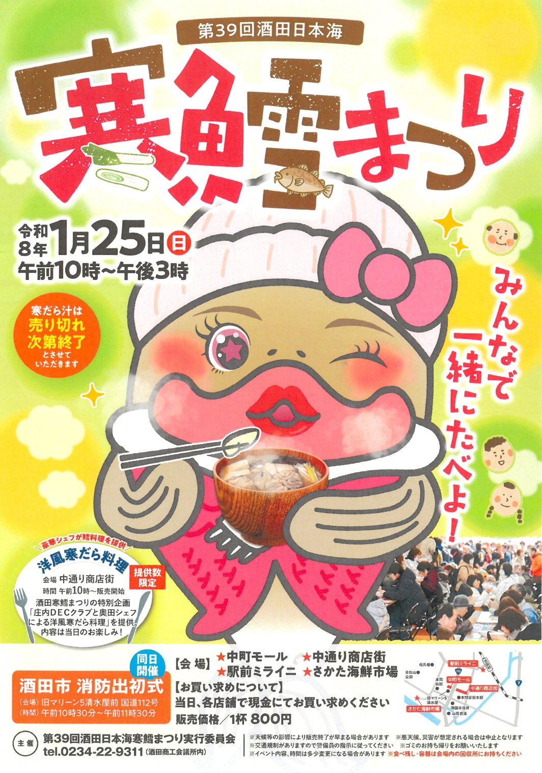 2026年1月25日(日)、酒田市内4会場にて、日本海の冬の味覚「寒鱈汁」を提供する 第39回 酒田日本海寒鱈まつり が行われます。