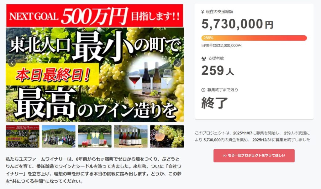 宮城県七ヶ宿町でワイン造りを行うユズファームワイナリーが、自社ワイナリー設立に向けたクラウドファンディングを実施し、目標金額を大きく上回る結果で終了しました... -